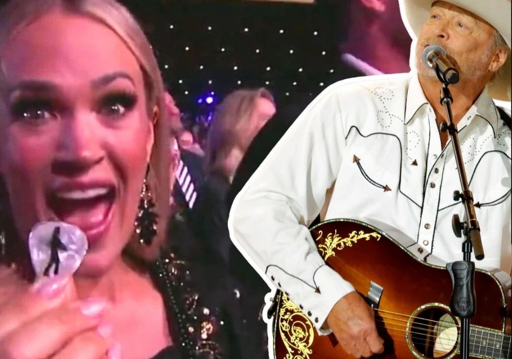 The audience was already on its feet when Carrie Underwood stepped into the spotlight. She didn't rush. She didn't gesture for attention. Instead, she stood still—composed, focused—until her gaze met Alan Jackson, seated quietly at center stage. There was no grand introduction, no dramatic buildup. Just a silence that felt weightier than sound itself, as if thousands of people had instinctively agreed to handle the moment with care.